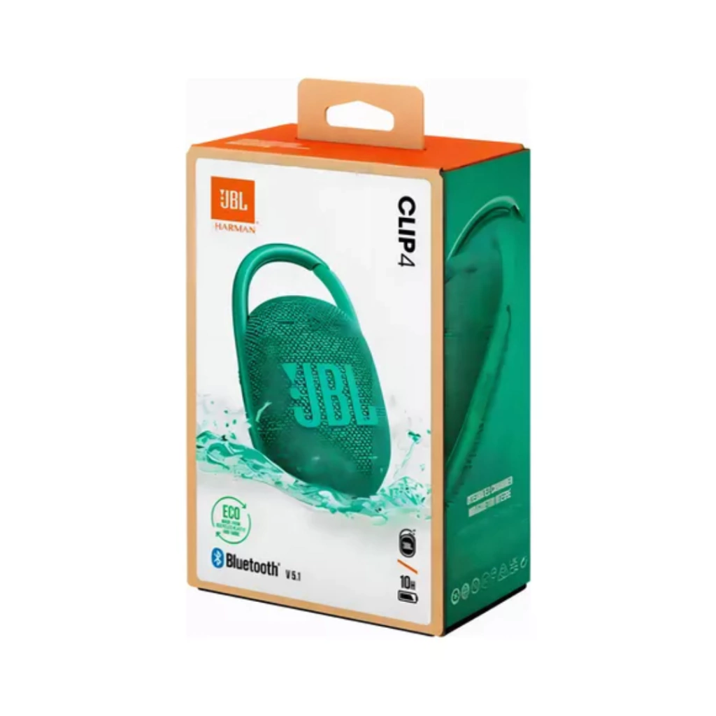 Parlante JBL Clip 4 en color verde con sonido JBL Original Pro y diseño compacto. Su estructura resistente incluye un mosquetón integrado que permite sujetarlo con seguridad a mochilas, bicicletas o cinturones. Perfecto para usar al aire libre, en la playa o durante viajes. Ofrece conectividad Bluetooth 5.1 para una conexión estable con smartphones y otros dispositivos, y hasta 10 horas de reproducción continua. Su cubierta de tela duradera combina funcionalidad con un diseño moderno y atractivo.